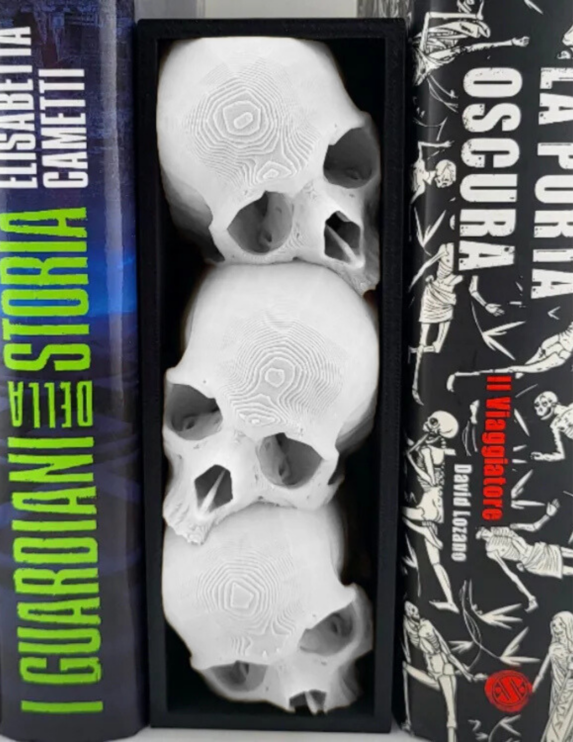 A unique 3D printed book nook with a skull motif that blends functionality with gothic charm for shelves.